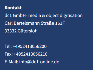 dc1 berücksichtigt jederzeit die Individualität Ihrer Inhalte. Bei allen Digitalisierungsvorhaben bestimmen die Quellformate und Materialien sowie die damit verknüpften Nutzungskonzepte die Qualitätsanforderungen und somit die Digitalisierung, den digitalen Transfer und die Bearbeitung und Bereitstellung der Inhalte.