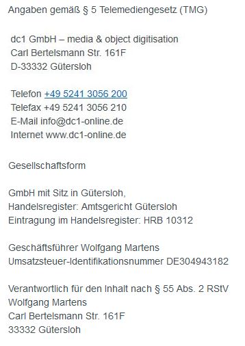 Die Inhalte dieses Internetangebots wurden mit größter Sorgfalt erstellt. Für die Richtigkeit, Vollständigkeit und Aktualität der Inhalte können wir jedoch keine Gewähr übernehmen. Als Diensteanbieter sind wir gemäß § 7 Abs.1 TMG für eigene Inhalte auf diesen Seiten nach den allgemeinen Gesetzen verantwortlich. Nach §§ 8 bis 10 TMG sind wir als Diensteanbieter jedoch nicht verpflichtet, übermittelte oder gespeicherte fremde Informationen zu überwachen oder nach Umständen zu forschen, die auf eine rechtswidrige Tätigkeit hinweisen. Diese Informationen stellt die dc1 GmbH ohne jegliche Gewährleistung oder Zusicherung jedweder Art, sei sie ausdrücklich oder stillschweigend, zur Verfügung.